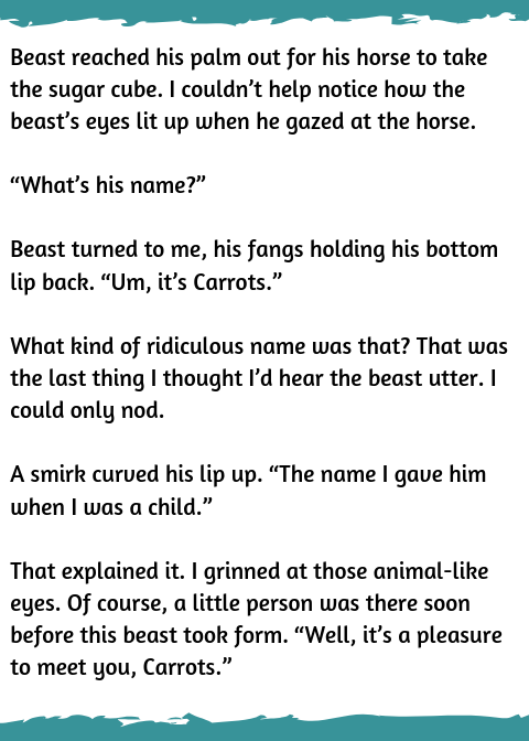 I had one scene that I wish I could have included. I was not to go over 13k so there was no way I had room for any of these additional scenes. But at least I can show one here. Here’s a deleted scene of Beast introducing Desiree to his horse. POV is Desiree.
